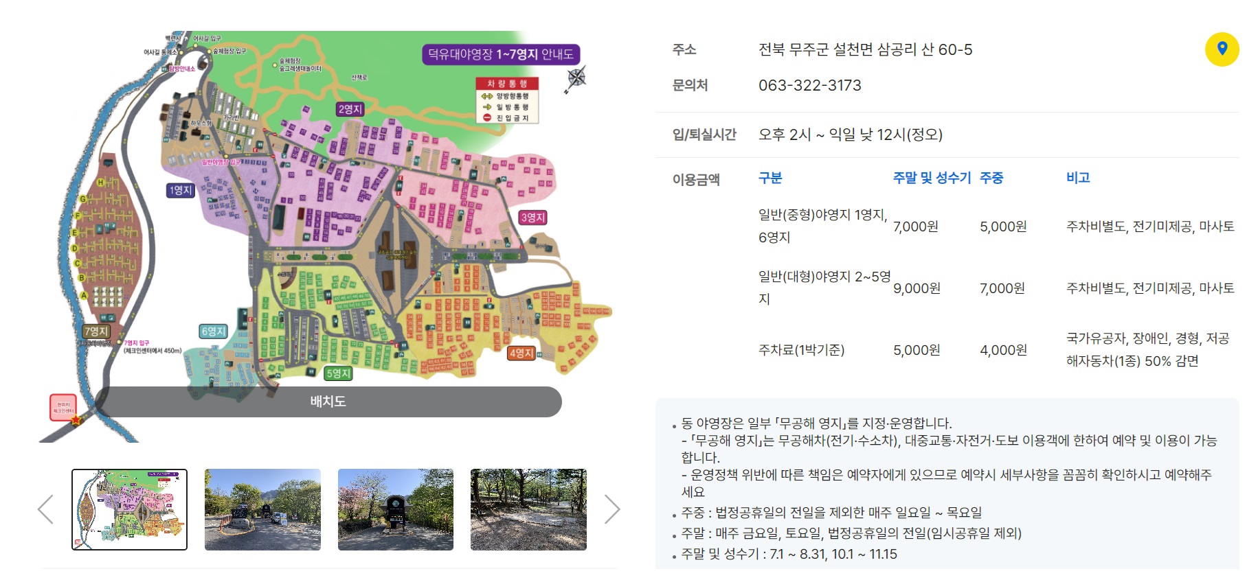 • 이용료: 1박에 약 40,000원에서 60,000원 정도로 사이트 크기와 위치에 따라 다릅니다.