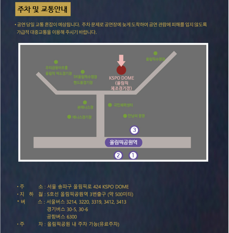 공연 장소인 올림픽공원 KSPO DOME의 주차는 유료로 제공됩니다. 주차 요금은 10분당 600원, 일 최대 20,000원이며 대형 차량은 10분당 1,200원, 일 최대 24,000원입니다. 주차 공간이 제한적이며, 공연일에는 혼잡이 예상되므로 가급적 대중교통 이용을 추천드립니다.
