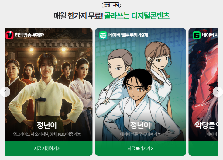 - 네이버 웹툰 및 시리즈: 매월 쿠키 49개가 제공되며, 인기 웹툰과 웹소설을 할인된 가격으로 이용할 수 있습니다.