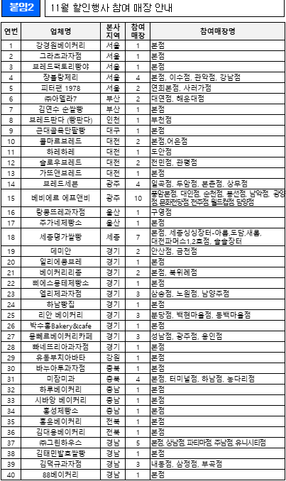 이번 할인 행사는 전국 82개 제과점에서 진행됩니다. 특히, 김덕규 과자점, 엘리제제과점, 베비에르 에프앤비, 랑콩뜨레과자점 등 제과·제빵 명장들이 운영하는 매장도 참여하니 품질에 대한 걱정은 접어두셔도 좋습니다. 추가 매장이 계속해서 합류할 예정이니, 가까운 동네 빵집의 참여 여부를 확인해보세요.