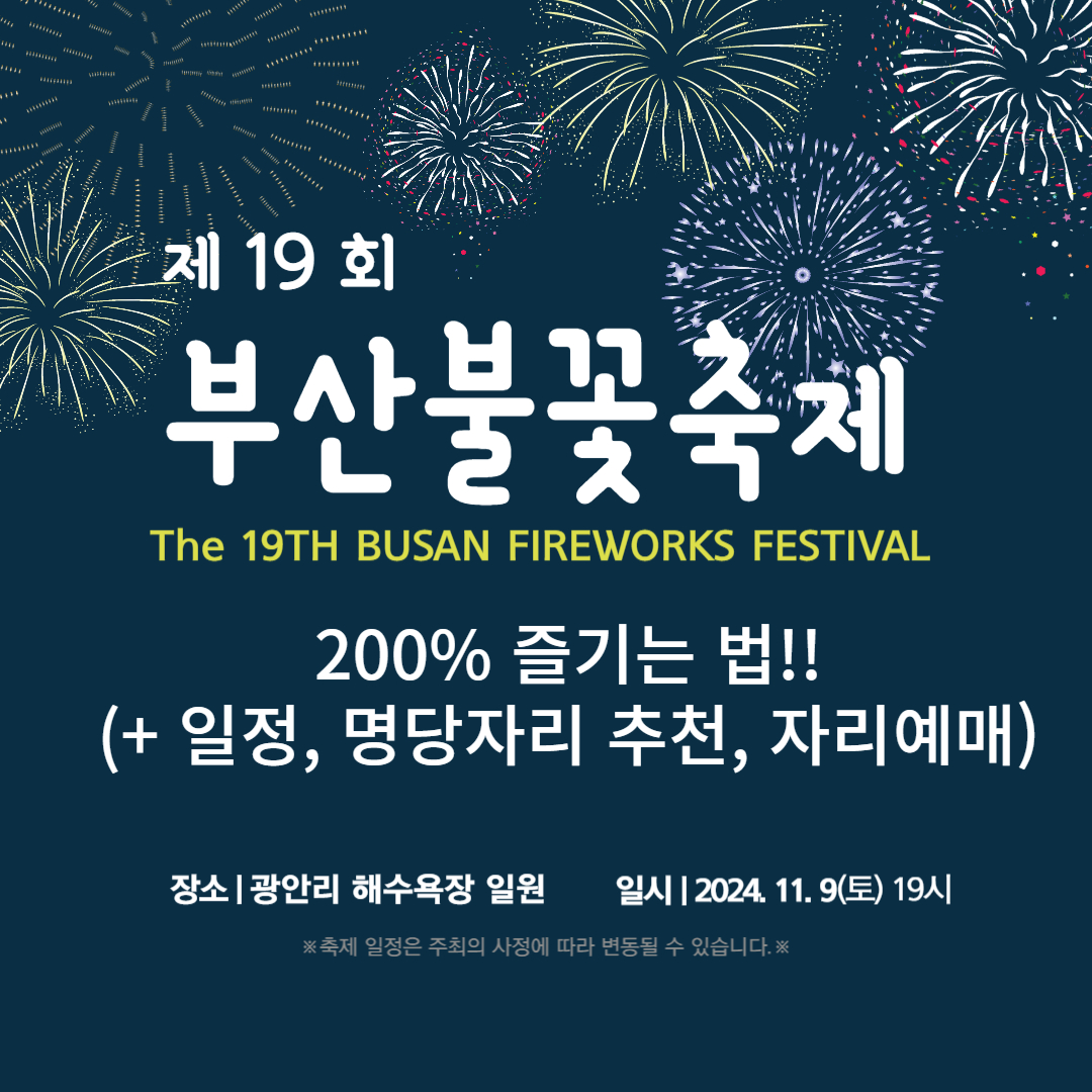 예매 방법: 부산불꽃축제 공식 홈페이지나 예매 사이트에서 예약이 가능합니다. 예매 오픈 일정이 빠르게 마감되므로, 예매 오픈 전 날짜를 확인하고 빠르게 예약하는 것이 중요합니다.