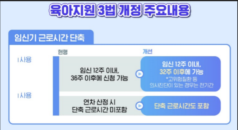 - 단축 기간: 최대 2년 → 최대 3년 (기본 1년 + 육아휴직 미사용 기간 X 2)