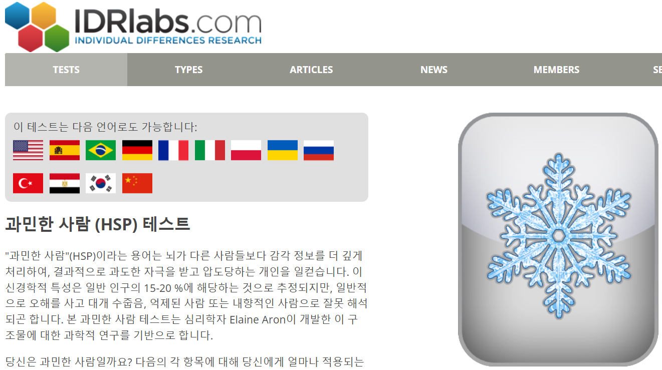 HSP 테스트는 IDR Labs의 HSP 테스트 사이트에서 무료로 진행할 수 있습니다. 테스트는 총 26개의 문항으로 구성되어 있으며, 각 문항은 HSP의 특성을 반영합니다. 응답자는 자신의 경험과 얼마나 일치하는지를 선택하여 답변하게 됩니다.