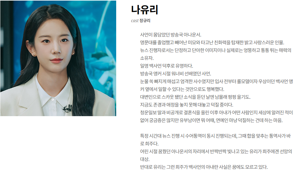 - 백사언의 동료 아나운서로 뛰어난 외모와 친화력을 지닌 캐릭터.