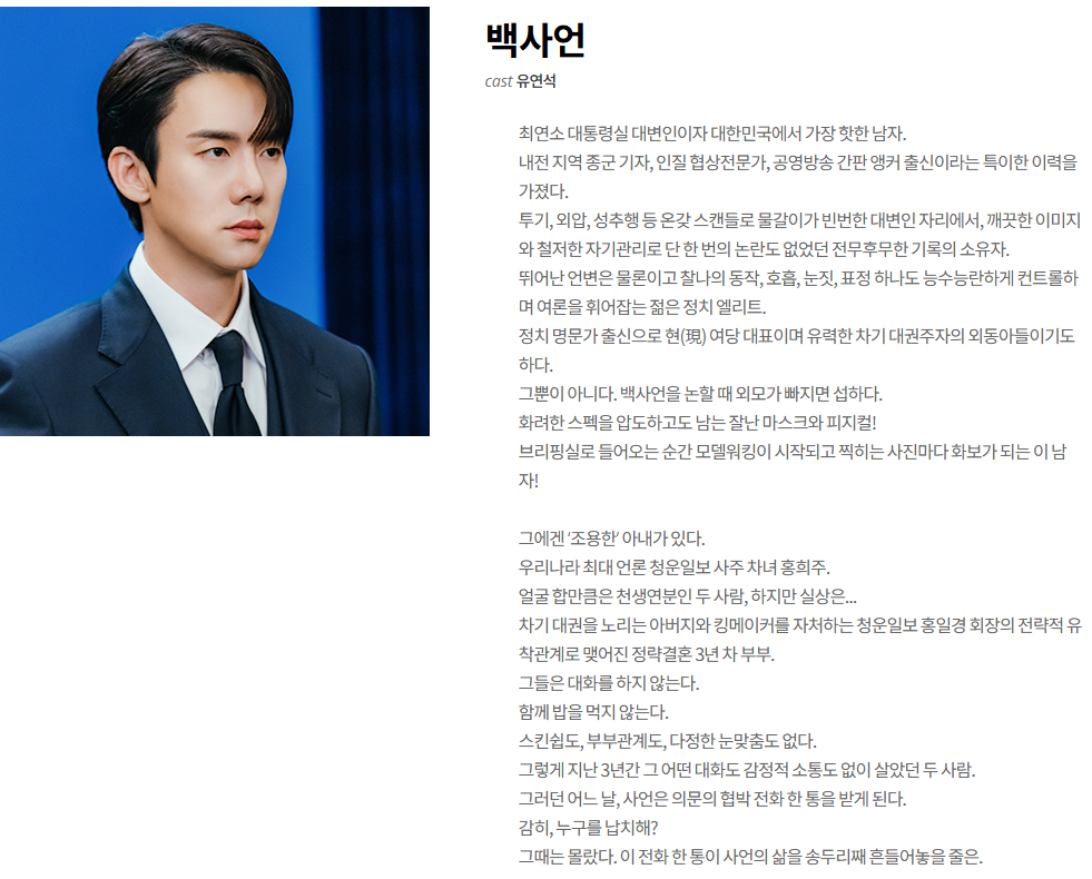 - 백사언의 냉철함과 홍희주의 내면적 갈등이 드라마의 몰입도를 높입니다.